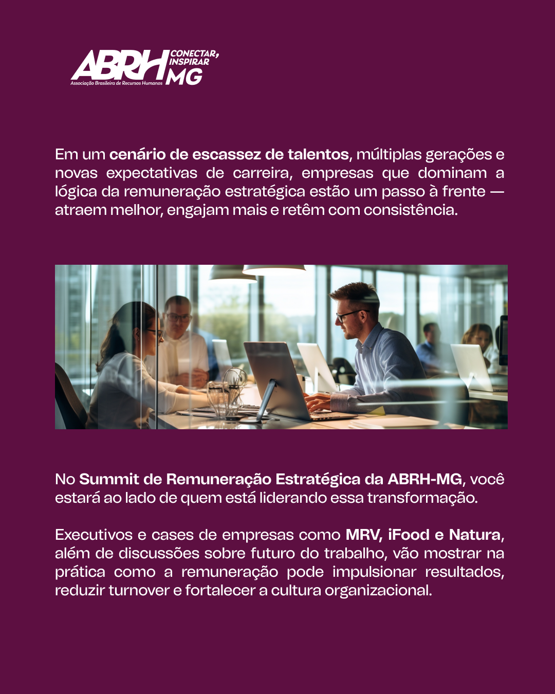 É o momento em que o conteúdo sai do debate restrito e ganha escala, impacto e visibilidade. Um espaço de síntese, troca qualificada e aprendizado coletivo, que reforça o papel da ABRH-MG como hub de conhecimento estratégico em capital humano, dos comitês:
